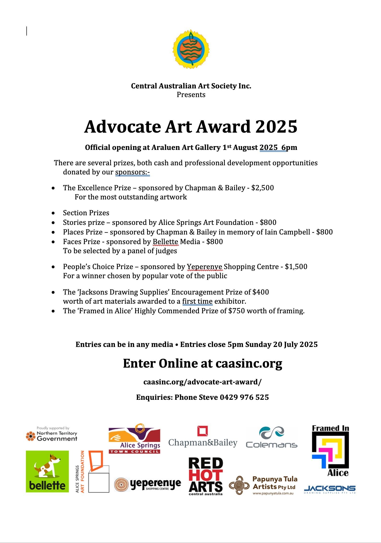 Annual Membership of the Central Australian Art Society (CAAS) runs from July 1 until June 30 the following year.